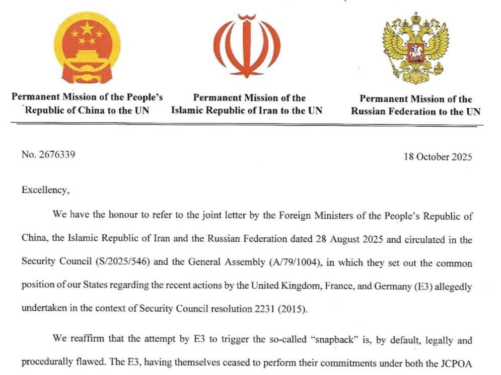 As clearly Stated in common letter of Foreign Ministers of People's Republic of China, Islamic Republic of Iran and Russian Federation dated 28 August 2025, addressed to UN Secretary General and Presidents of UN Security Council and General Assembly, the E3 action is illegal and unwarranted and their move should not affect the legal reality of the resolution's termination on October 18, 2025, and any attempt to revive expired sanctions after this date will be considered as null and void.