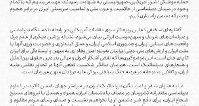 -تأکید بر این نکته ضروری است که ملت ایران بر اساس سوابق تاریخی خود، هرگز تسلیم تجاوزات خارجی نخواهد شد. ایران با قاطعیت در برابر سلطه‌طلبی و دست‌اندازی‌های خارجی از خود دفاع خواهد کرد، در برابر کسانی که حاکمیت ملی، تمامیت ارضی و استقلال آن را نقض می‌کنند ایستادگی کرده و پشیمانی متجاوزان را تضمین خواهد کرد.