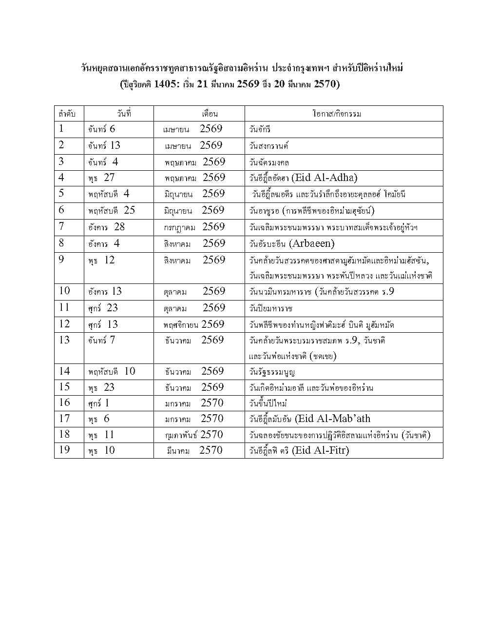 วันหยุดสถานเอกอัครราชทูตสาธารณรัฐอิสลามอิหร่าน ประจำกรุงเทพฯ สำหรับปีอิหร่านใหม่